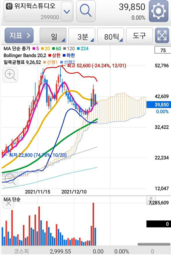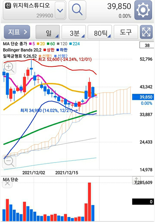 12월 27일 동영상 제작과 콘텐츠 제작을 전문으로 하는 위지윅스튜디오 주가는 39,850원에 그쳤습니다. 이는 전거래일의 12월 24일 종가에 비해 11.44%의 하락인데요. 아침에 주식 시장이 열리자마자 위지윅스튜디오 주가는 한순간에 약 2,000억원의 시가총액이 날아갔습니다.